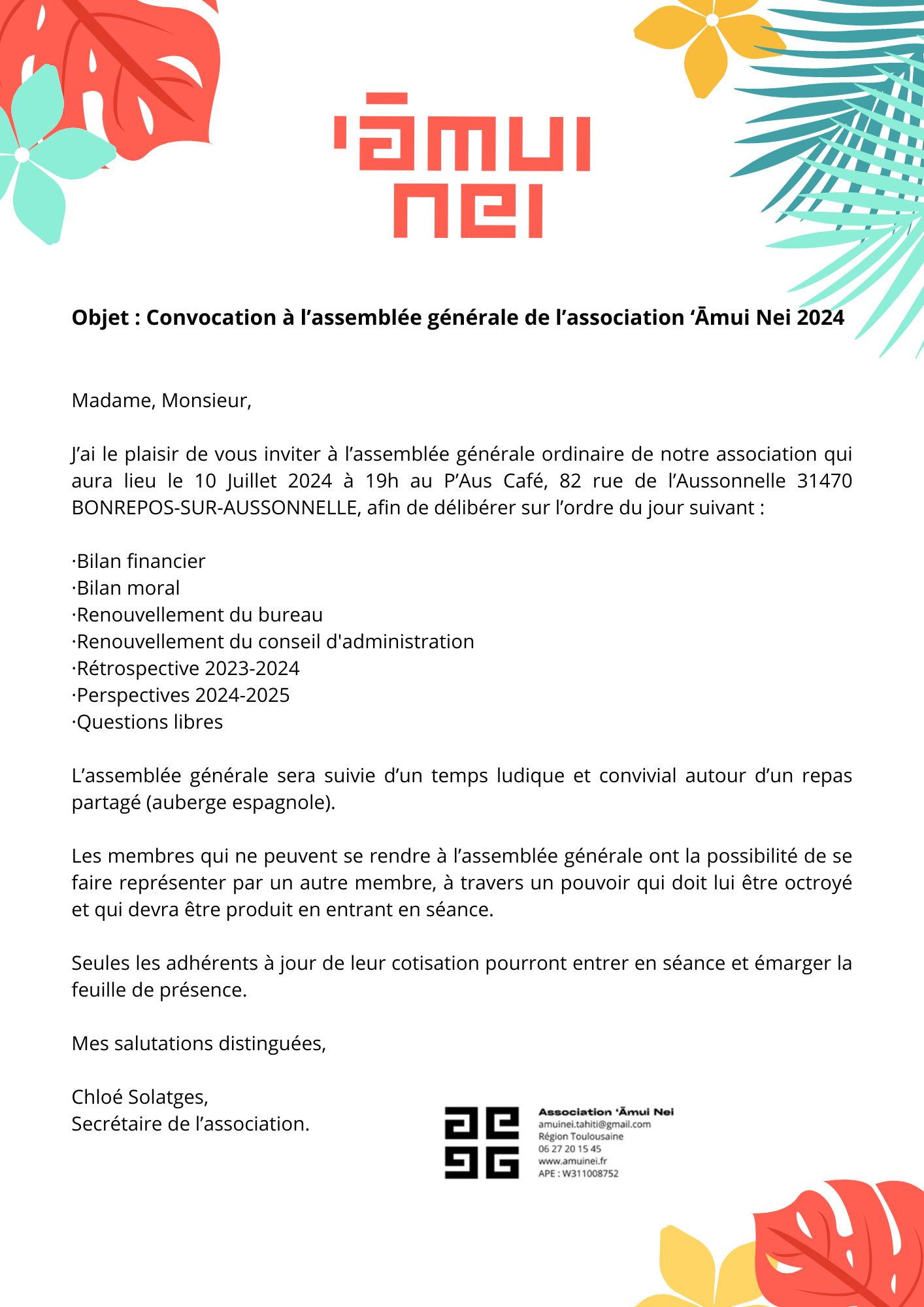Tu trouveras ci-dessous le compte-rendu de l'Assemblée Générale Ordinaire 2024 de l'association, ainsi que les documents correspondant : convocation, bilan moral, bilan financier.